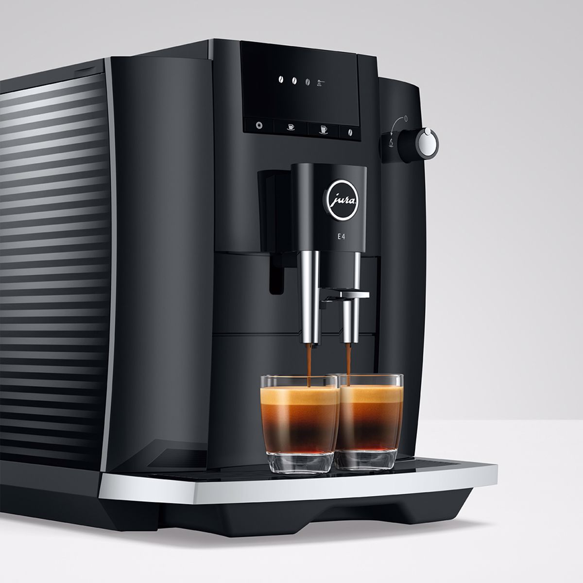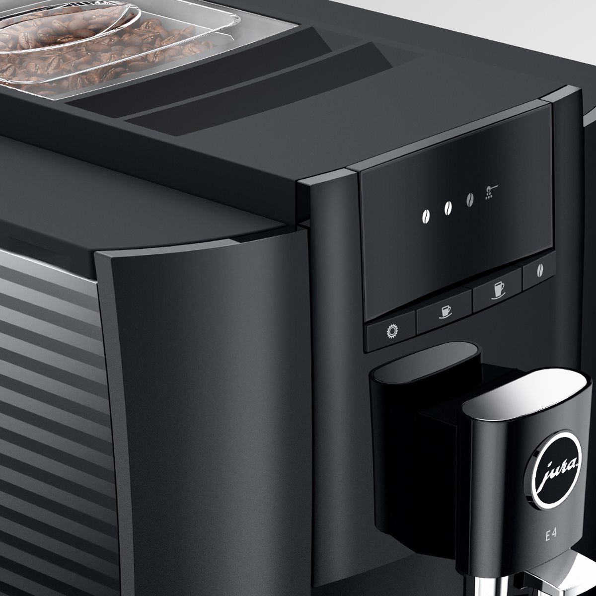 E4 má charakteristický design automatických kávovarů značky JURA. Vyznačuje se jasně vymezenými plochami a ostře vedenými liniemi. Úsporný tvarový výraz a zpracování s nejvyšší možnou precizností podtrhují prvotřídní kvalitu tohoto automatického kávovaru. Purismus se projevuje také ve výběru barev. Zatímco celý korpus je v decentní barvě Piano Black, chromované prvky udávají akcenty a jsou příslibem dokonalého výsledku kávy.
