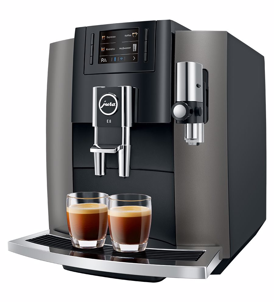 Nejúspěšnější automat od značky JURA byl dále zdokonalován. Celkem dvanáct různých specialit připravíte s modelem E8 jediným stisknutí tlačítka. Novým přírůstkem do sortimentu je espresso macchiato, espresso doppio, káva speciál a horká voda pro zelený čaj připravované jedním stisknutím tlačítka.