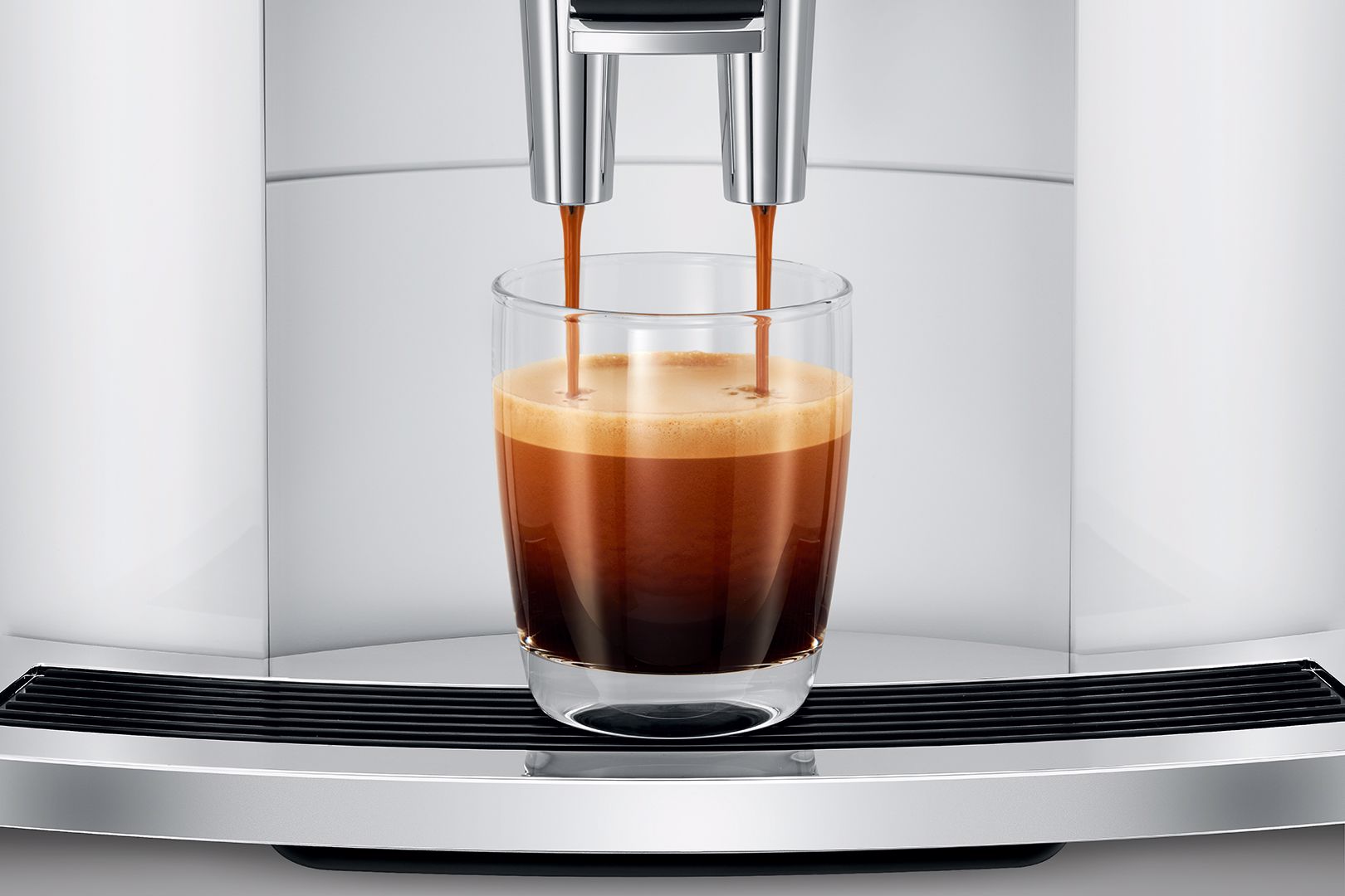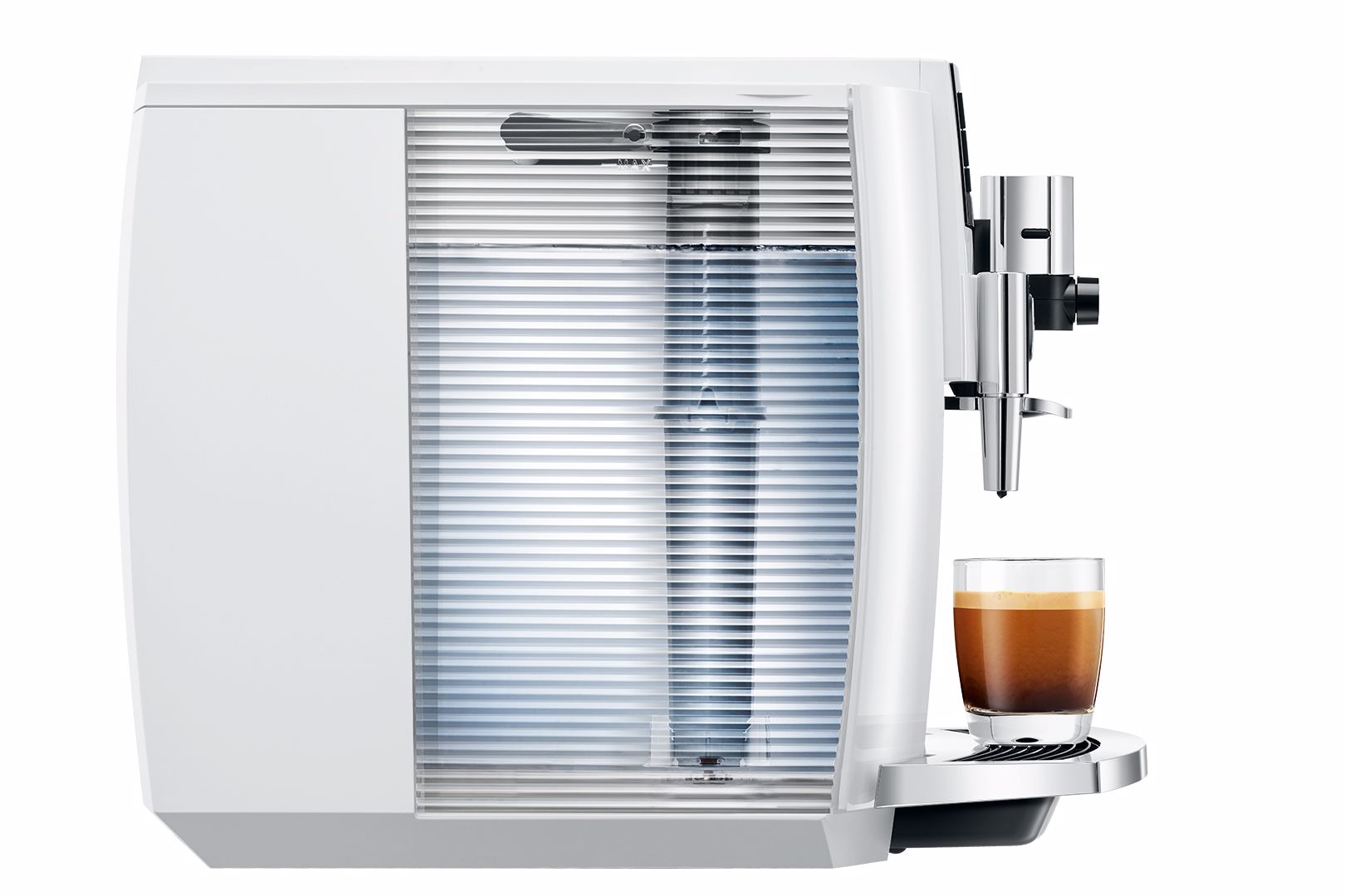 Nádržka na vodu v designu jemného vlnkování boční strany zdůrazňuje jasný designový jazyk. Kovová rukojeť nádržky přináší vysokou hodnotu díky na dotek příjemnému povrchu. Na novém, chromovaném podstavci šálků výborně vyniknou dokonale připravené kávové speciality. Potěšení pro oko.