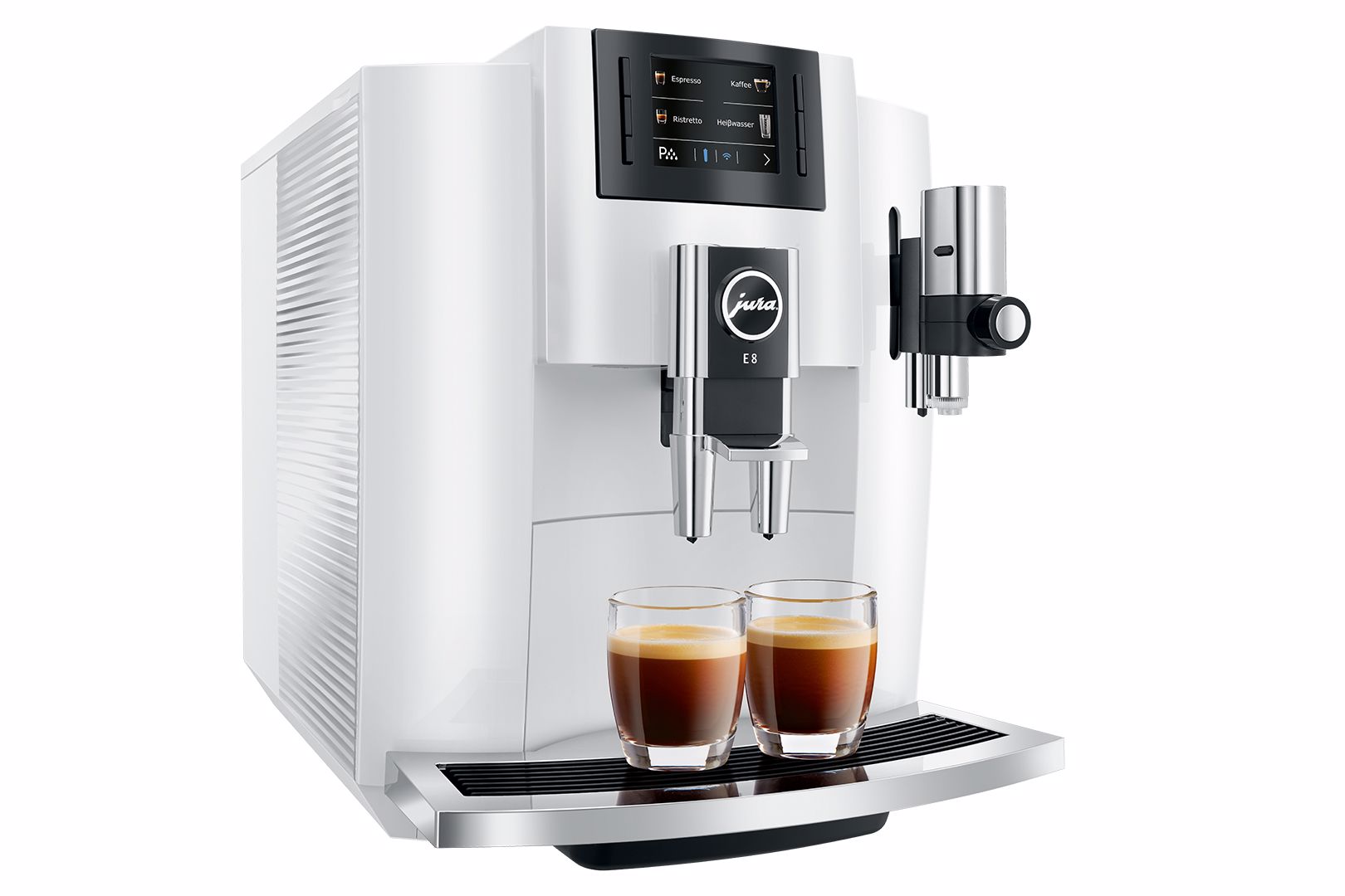 Nejúspěšnější kávovar od značky JURA byl dále zdokonalován. Celkem dvanáct různých specialit připravíte s modelem E8 jediným stisknutím tlačítka. Novým přírůstkem do nabídky nápojů je espresso macchiato, espresso doppio, káva speciál a horká voda pro zelený čaj, vše připravované jediným stisknutím tlačítka.