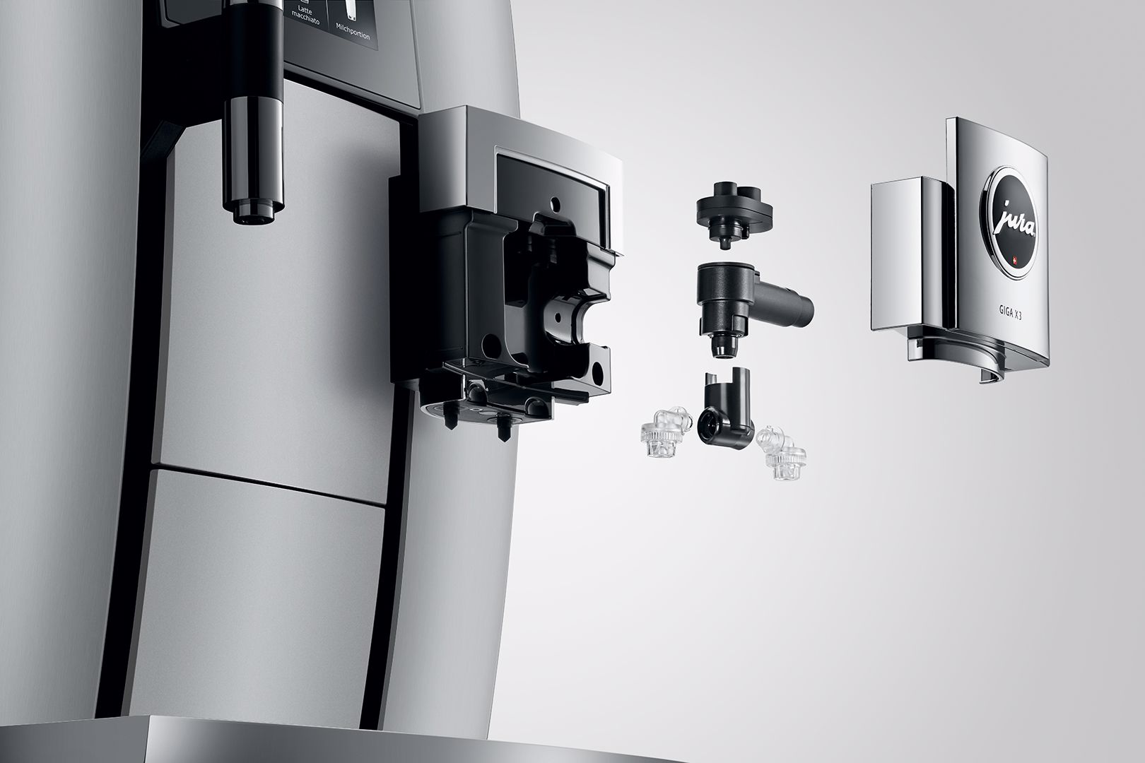 Stejně snadno, logicky a intuitivně jako ovládání probíhá i údržba kávovaru GIGA X3. Originální čisticí prostředky značky JURA i integrované programy proplachování a čištění zaručují hygienu s certifikací TÜV, a to jediným stisknutím tlačítka. Stejně promyšlené je čištění systému pro dávkování mléka. Spouští se plně automaticky a jediným dotykem displeje a zaručuje dokonalou čistotu při manipulaci s mlékem. Několika jednoduchými pohyby je možné rozložit masivní kombinovanou trysku. Vývody pro mléko jsou umístěny vpředu a jsou snadno přístupné, takže je lze v případě potřeby snadno vyměnit.