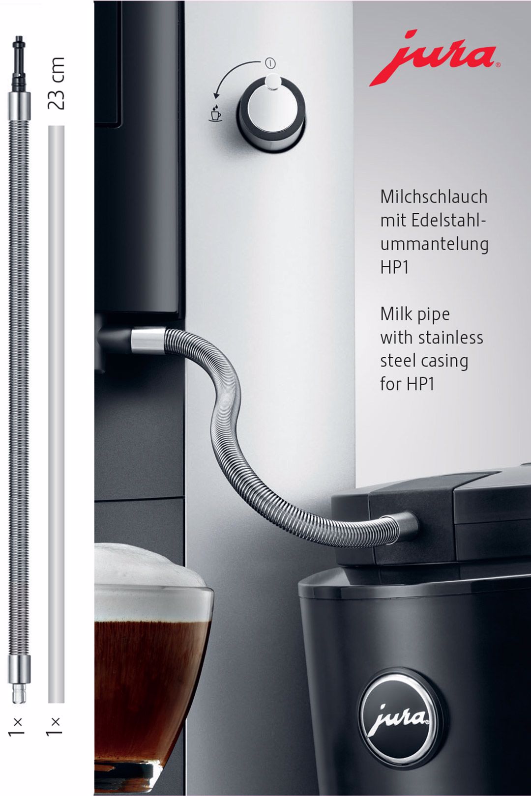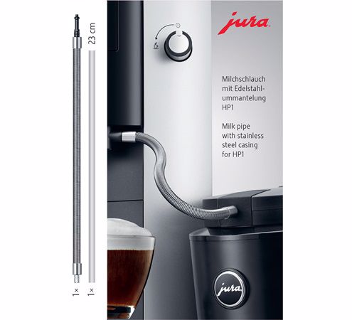 Hadička na mléko opletená kvalitní spirálovou pružinou z nerezové oceli spojuje nádobku na mléko s hubicí na mléko a dokresluje tak elegantní design každého plně automatického kávovaru. Neprůhledné opláštění z ušlechtilého materiálu zaručuje nejlepší ochranu před UV zářením a působením světla. Přesně slícované zásuvné spoje zajišťují vzduchotěsnost přechodů. Tato hadička je připravena k okamžitému použití a představuje tak optimální řešení pro maximální hygienu systému rozvodu mléka.