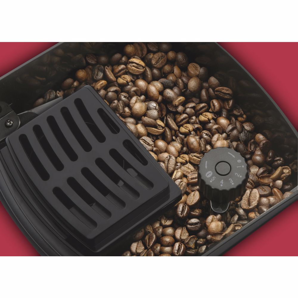 Technické parametry Tlak 19 bar Objem zásobníku na vodu: 1,8 l Nastavitelná hrubost mletí (5 stupňů) Kapacita zásobníku na zrna: 250 g Kapacita kontejneru na kávovou sedlinu: 15 porcí Materiál: plast/nerez Příkon: 1400 W Barva: červená Rozměry (v x š x h): 37 x 30 x 40 cm Hmotnost: 13 kg Délka přívodního kabelu: 120 cm Napětí a frekvence: 220-240 V, 50/60 Hz