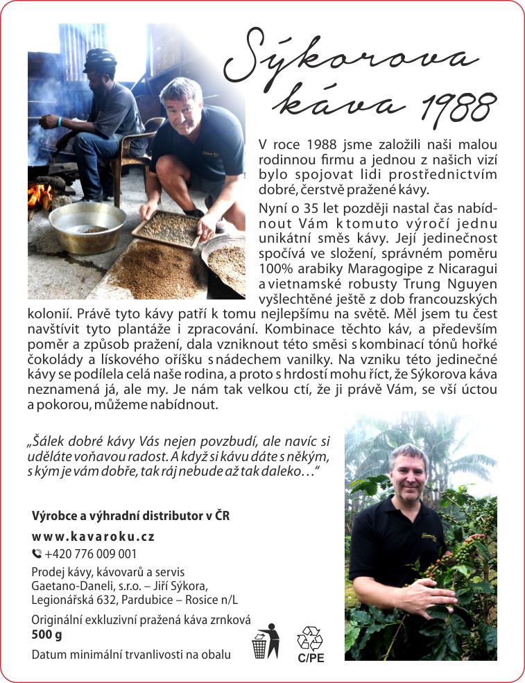 V roce 1988 jsme založili naši malou rodinnou firmu a jednou z našich vizí bylo spojovat lidi prostřednictvím dobré, čerstvě pražené kávy. Nyní o 35 let později nastal čas nabídnout Vám k tomuto výročí jednu unikátní směs kávy. Její jedinečnost spočívá ve složení, správném poměru 100% arabiky Maragogipe z Nicaragui a vietnamské robusty Trung Nguyen vyšlechtěné ještě z dob francouzských kolonií. Právě tyto kávy patří k tomu nejlepšímu na světě. Měl jsem tu čest navštívit tyto plantáže i zpracování. Kombinace těchto káv, a především poměr a způsob pražení, dala vzniknout této směsi s kombinací tónů hořké čokolády a lískového oříšku s nádechem vanilky. Na vzniku této jedinečné kávy se podílela celá naše rodina, a proto s hrdostí mohu říct, že Sýkorova káva neznamená já, ale my. Je nám tak velkou ctí, že ji právě Vám, se vší úctou a pokorou, můžeme nabídnout.